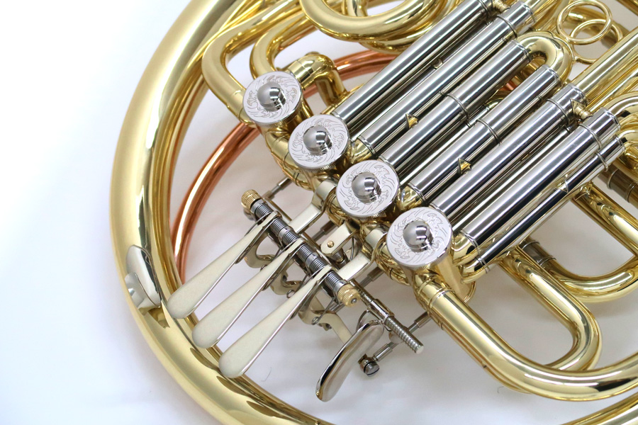 1種類の調子のみで設計されているため、楽器の構造もシンプルなため軽量で吹きやすく、価格もお求めになりやすくなるため、初心者用として使用されることも多いホルンです。 ホルンらしい音色を求める場合はF調、コントロールのしやすさではBb調等、それぞれの特徴があります。 - ダブルホルン: